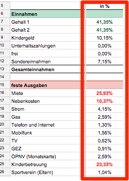 Bei den Ausgaben (und den Einnahmen) gibt es eine Spalte, die anzeigt, wie viel Prozent der Gesamtkosten eine Kostenstelle einnimmt. Außerdem kann man durch einfaches entfernen von einzelnen Werten sofort die Auswirkungen auf das Gesamtbudget sehen und sich somit überlegen, wo man am besten Geld einsparen kann.