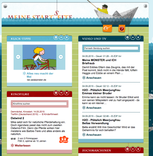 Hier können sich Kinder ihre eigene Startseite einrichten. Man kann verschiedene, vorgegeben Widgets platzieren und abspeichern. Es gibt Einstiegsmöglichkeiten zu einem eigenen Email-Account (mail4kidz), Suchmöglichkeiten, Spieletipps, TV-Empfehlungen und moderierte Chatmöglichkeiten.