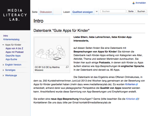 Das Media Literacy Lab der Universität Mainz hat 2013 im Rahmen einesdreiwöchigen Online-Workshops eine lange Liste mit guten Kinder-Apps zusammengestellt. Die Vorauswahl trafen Medienpädagogen, danach wurden die Apps aber auch von Kindern und Eltern getestet und besprochen. Daraus entstand ein WIKI, in dem man alle Apps nachschlagen kann. Einige Apps werden auch als Podcast von Kindern besprochen. Das Archiv ist zwar nicht auf dem ganz neuesten Stand, umfasst aber viele Apps, die auch nach zwei Jahren noch empfehlenswert sind.