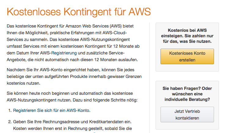 Hier klicken und ein kostenlosen AWS Account erstellen (wenn man schon einen Amazon-Account hat, einfach nach dem Klick damit anmelden)