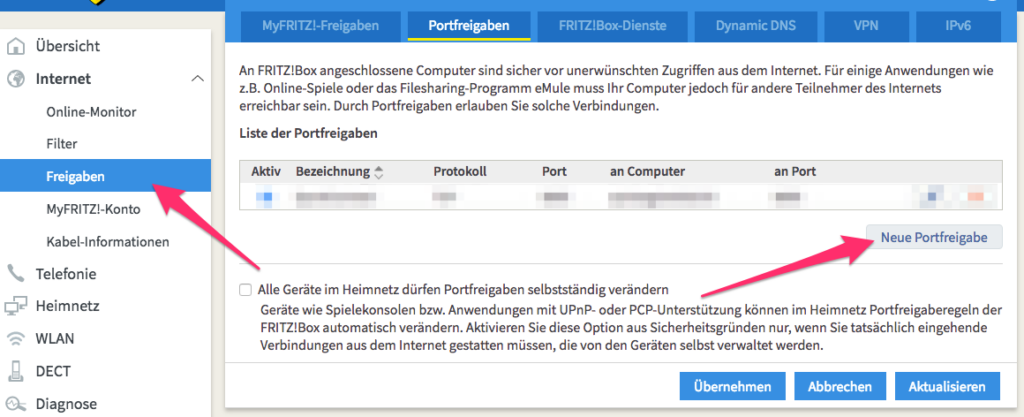 Auf "Internet->Freigaben->Portfreigaben" klicken.
