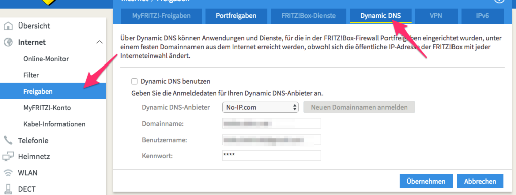 Dann zurück zur FritzBox und in "Internet->Freigaben->Dynamic DNS". Dort gibt man die Zugangsdaten von noip.com ein.