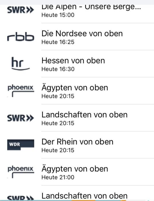 „Das Ruhrgebiet von oben“, „Der Südwesten von oben“, „Landschaften von oben“, „Hessen von oben“, „Die Nordsee von oben“ und „Ägypten von oben“. Ein Streifzug durch das Feiertagsangebot der dritten Programme zeigt eine Tendenz zum Draufblick auf Landschaften.