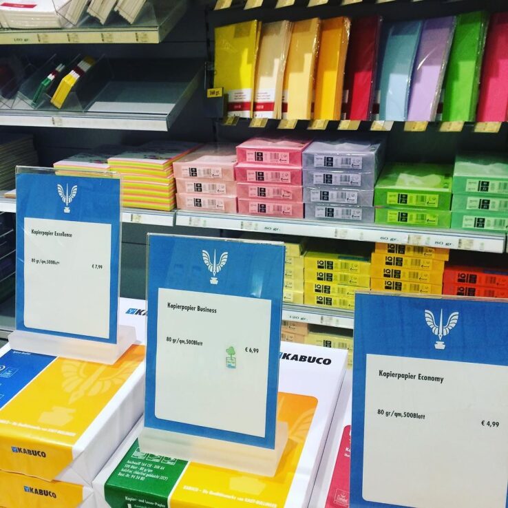 Dann geht es ins Büromaterialfachgeschäft. Am Morgen ist mir das Druckerpapier ausgegangen und vor drei Wochen hab ich meine Steuererklärung abgegeben. Beide Ereignisse hängen kausal zusammen. Elster will halt immer auch noch Papierbelege. Ich muss mich zwischen den Papierklassen Excellence, Business und Economy entscheiden und nehme selbstverständlich Business. Die Beinfreiheit ist es mir wert.