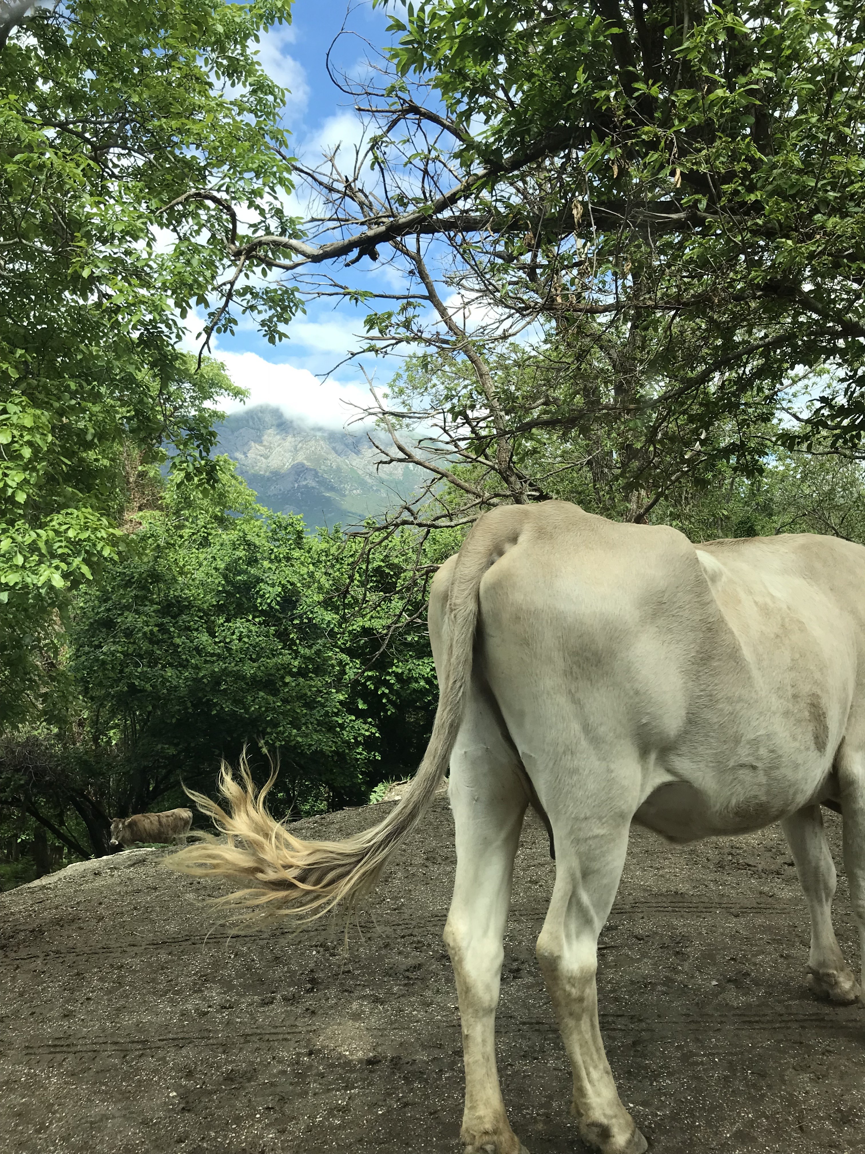 Und zwar nicht auf eingezäunten Weiden, sondern einfach so. Es ist üblich, dass die markierten Tiere frei in der Gegend herumlaufen. V.a. auf den engen, steilen Bergstraßen im Landesinneren muss man eigentlich ständig damit rechnen, dass hinter der nächsten Kurve ein Kuh oder ein Pferd steht. Aber auch auf sehr engen Wanderwegen und am Strand haben wir Kühe getroffen.