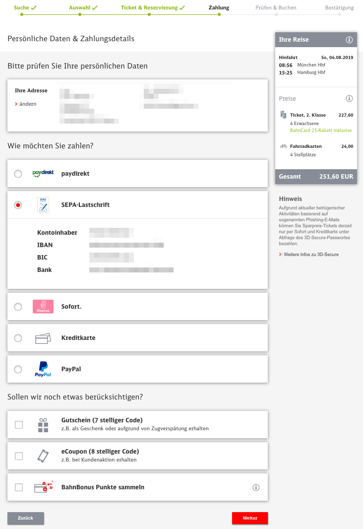 Noch schnell ein paar Häkchen bei den Zahlungsdetails gesetzt, BahnBonus-Punkte gesammelt und dann auf „Weiter“.