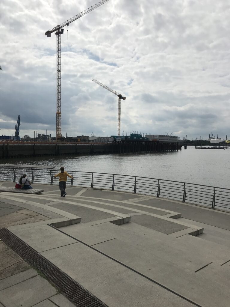 In Hamburg haben wir dann noch einen Nachmittag Zeit und fahren ein bisschen mit dem Fahrrad rum. Richtung Hafencity. Für Hamburger ist das wahrscheinlich ein übles Gentrifizierungsquartier mit überteuerten Preisen. Aber gentrifizierungstechnisch schockt einen Münchner eh nix mehr und die Kinder finden die ganze Uferpromenade parkourtechnisch sehr attraktiv.