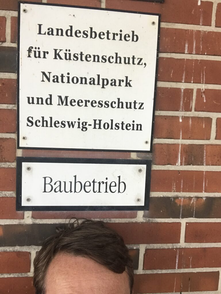 Nach der ersten Hälfte erwischt uns ein deftiges Gewitter. Zum Glück dürfen wir uns beim "Landesbetrieb für Küstenschutz, Nationalpark und Meeresschutz Schleswig-Holstein" unter dem Behördenvordach unterstellen. Regenschauer vs. Bielinski: 0:4