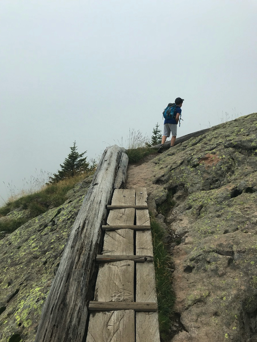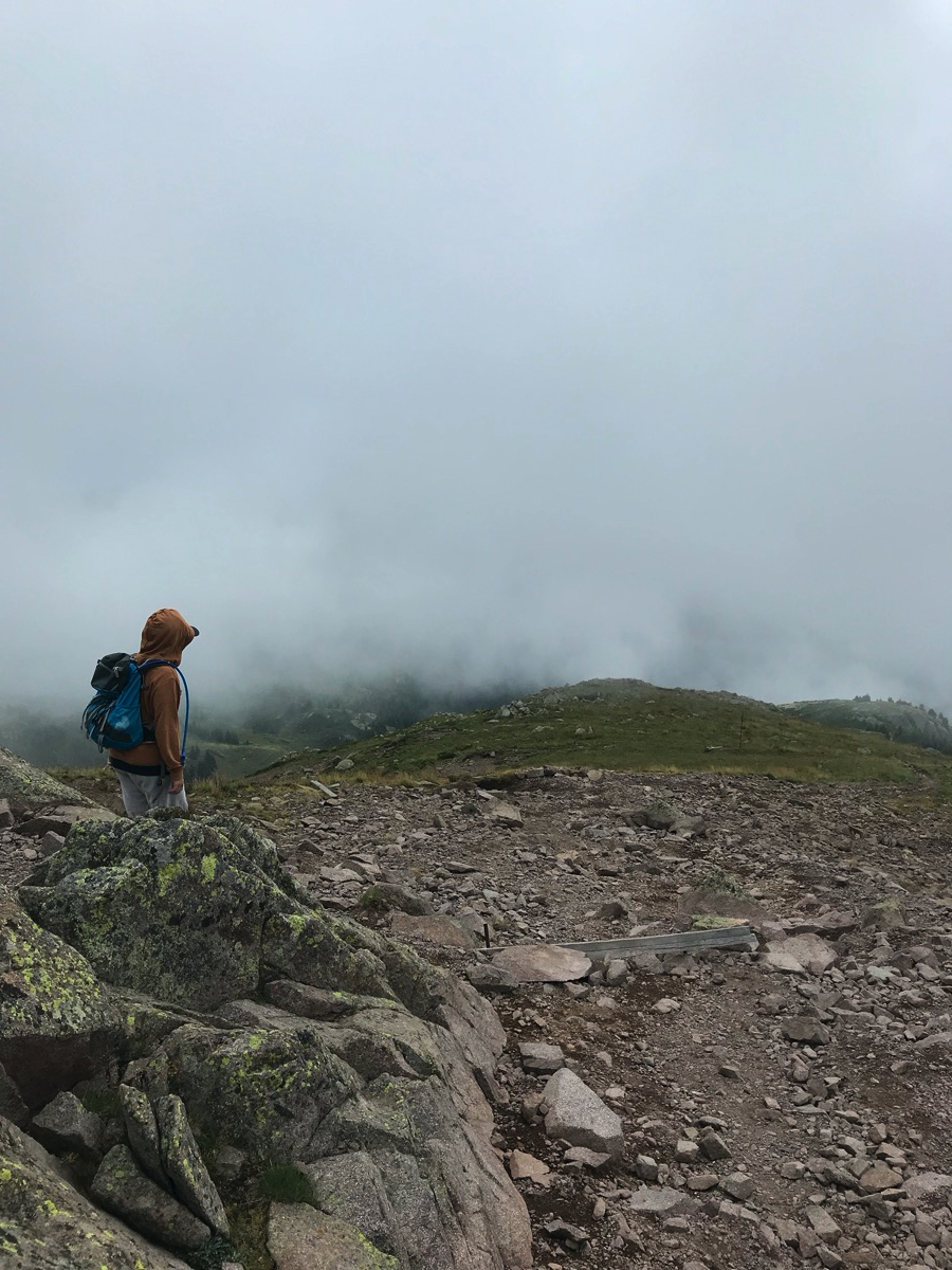 Es geht los am frühen Morgen am Gampenpass. Man kann die Runde von dort aus in beide Richtungen starten. Wir gehen direkt am Anfang nach rechts hoch. Es wird sofort steil, Trittsicherheit auf dem Wanderpfad ist angebracht. Je weiter wir hochkommen, desto nebliger und bewölkter wird es.