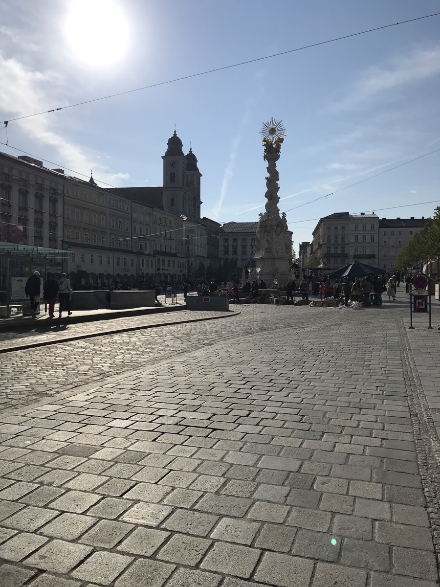 Der Linzer Hausberg ist der Pöstling. Man sieht ihn schon vom Hauptplatz aus. Das verleitet einige von uns, ihn in einem kurzen Spaziergang zu erreichen. Stellt sich dann doch als etwas längerer Weg mit Steigung und Schwitzen raus. 1,5 Stunden sollte man vom Zentrum aus mindestens einplanen. Wer es einfacher mag, steigt am Hauptplatz in die nostalgische Pöstlingbergtram ein. Die fährt bis hoch zur Burg. Auf dem Weg kommt man auch am betonlastigen Linzer Rathaus vorbei. Insgesamt eine interessante städtebauliche Mischung aus Altbau und Brutalismus.