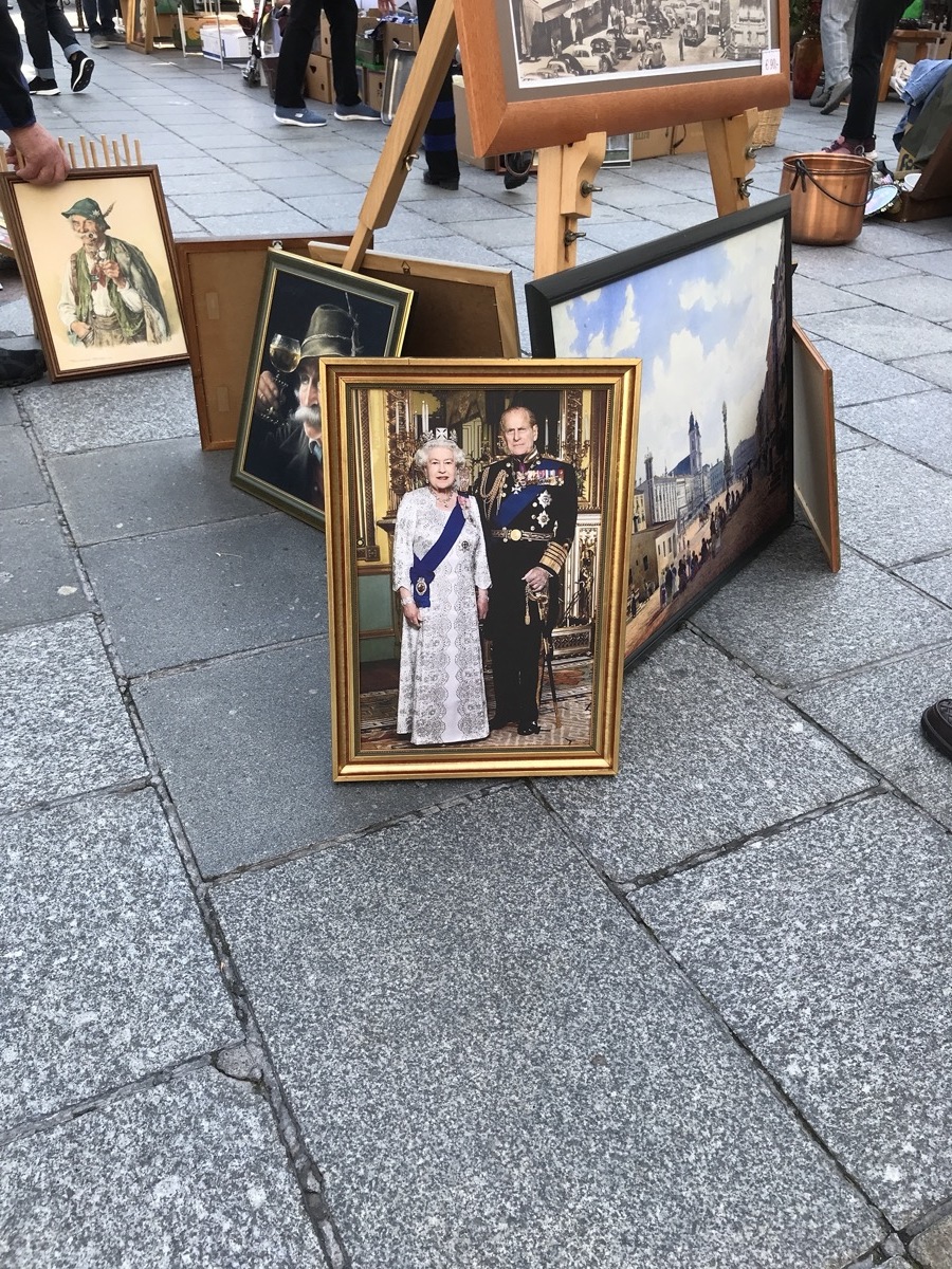 Vom Platz aus machen wir gleich am Ankunftsabend noch einen kleinen Spaziergang entlang der Donau. Am nächsten Morgen ist Flohmarkt mit passendem Gemäldeangebot zur Weltlage.
