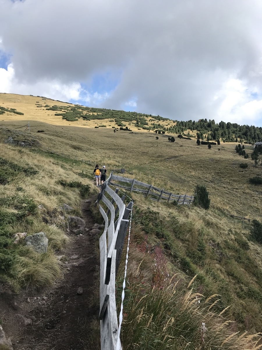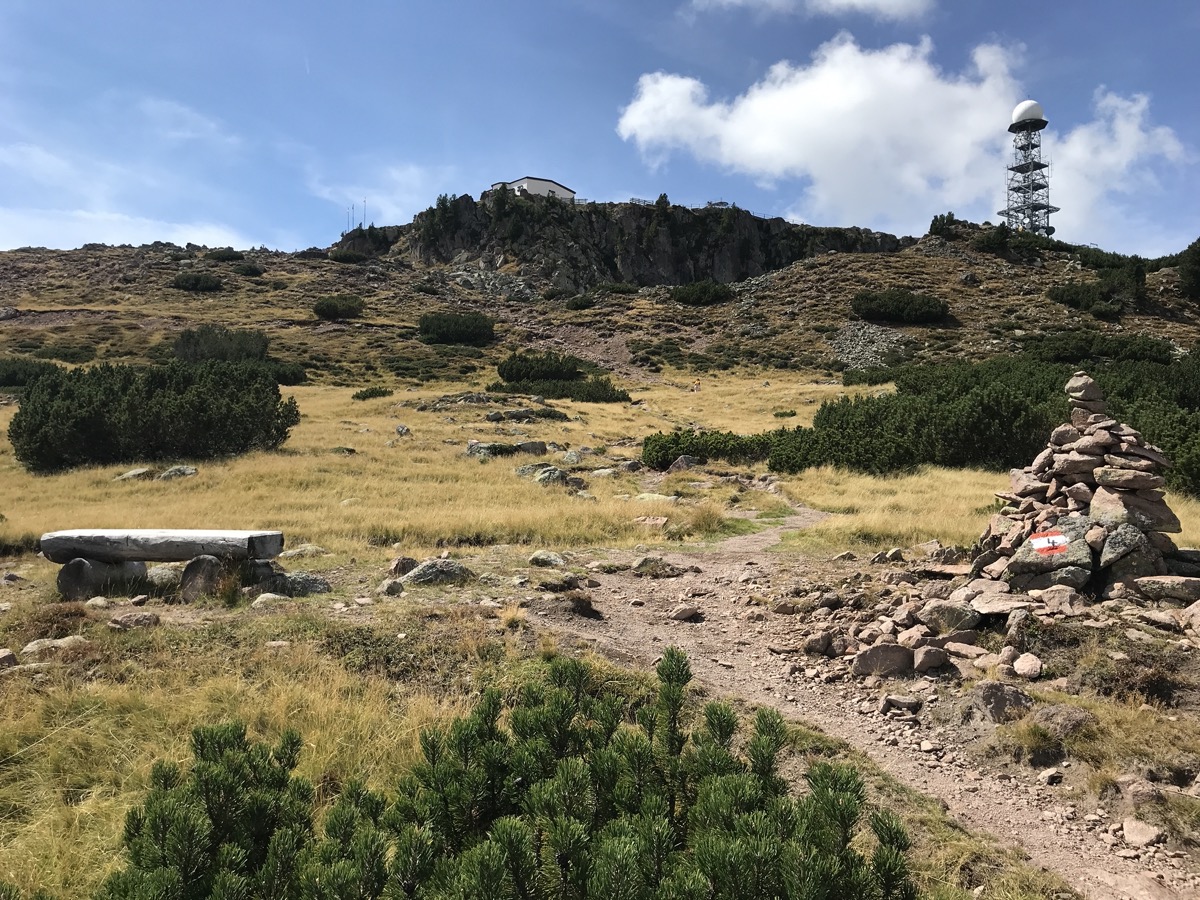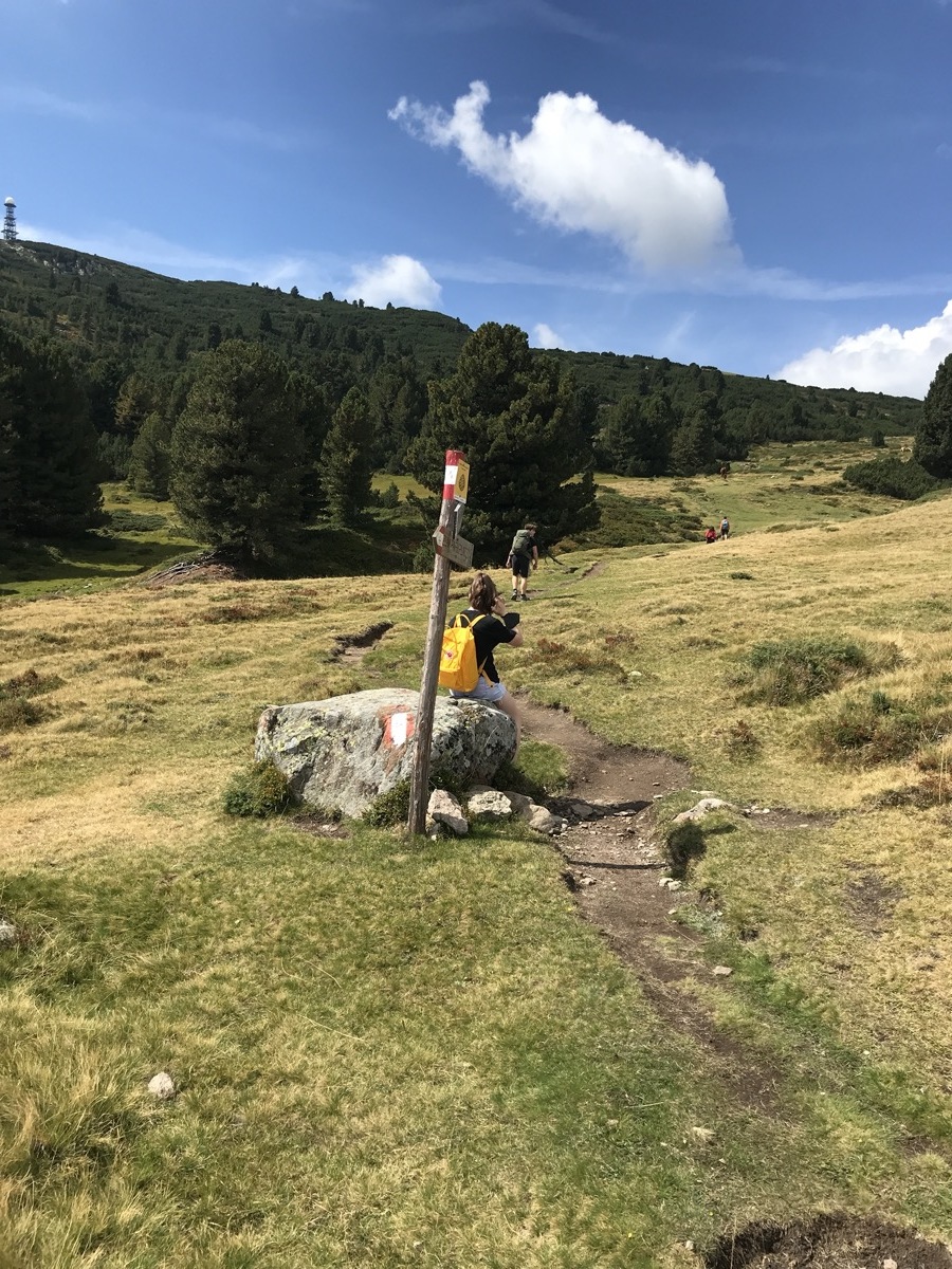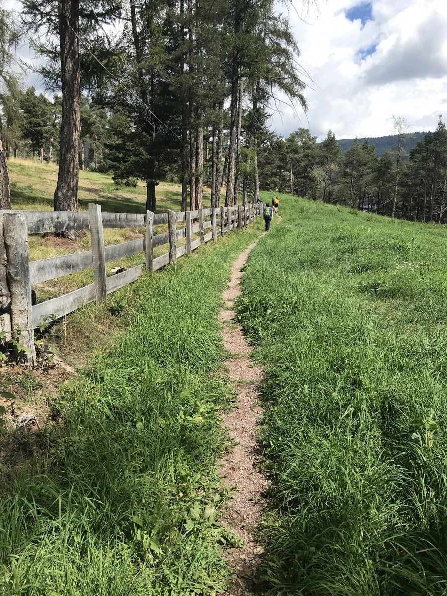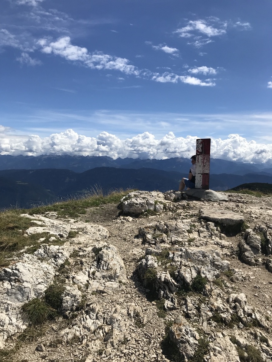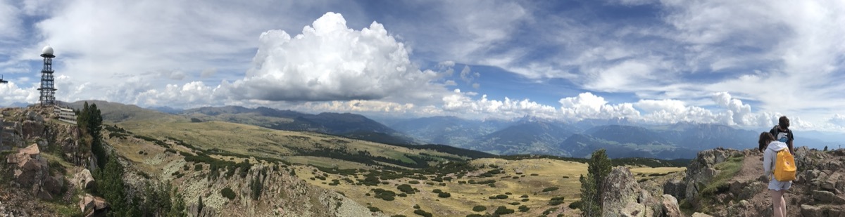 Das Rittner Horn erreicht man mit einem gut abgestimmten ÖPNV-Mix. Zuerst mit dem Bus zur Talstation der Rittner Seilbahn, die in unmittelbarer Nähe zum Bahnhof liegt. Hoch aufs Plateau und ab in die Schmalspurbahn bis Endhaltestelle Klobenstein, weiter mit dem Bus zur Talstation der Seilbahn Rittner Horn. Bis hierhin alles im WinePass enthalten. Die letzte Seilbahn kostet dann extra. Oben am Berg kann man dann entweder sehr direkt und einfach bis zum Gipfel laufen (ca. eine Stunde). Wir entscheiden uns für einen Teil der Südtiroler Himmelstour. Die ist sehr hübsch, es ist wenig los, aber dafür ist es, v.a. im letzten Abschnitt ganz schön steil. Der Ausblick entschädigt aber alles.