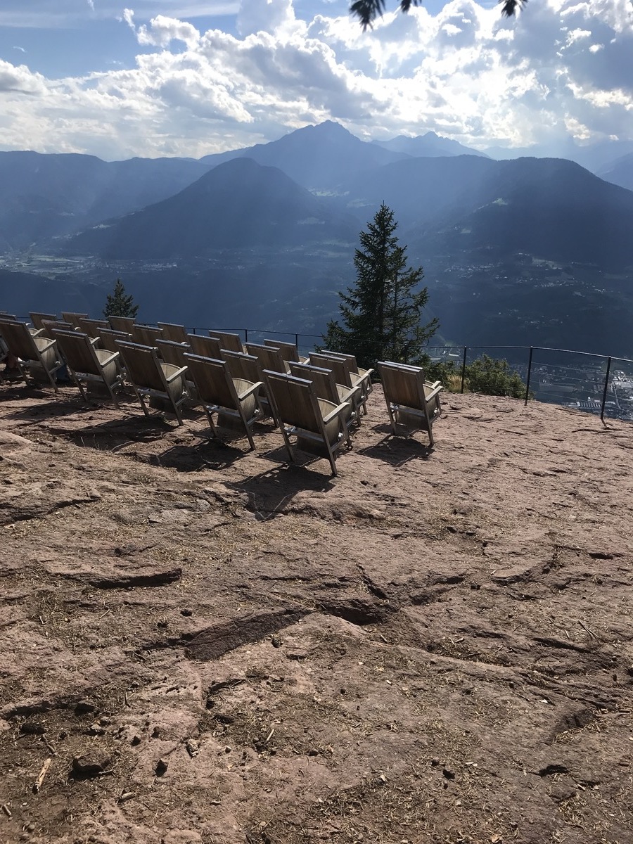 Knottn ist Dialekt und bedeutet „Fels". Oberhalb von Vörlan hat ein Künstler mehrere Aussichtspunkte gestaltet. Highlight ist das Knottkino mit 30 Kinositzen und einem überwältigenden Ausblick über das Etschtal. Man kann alle Aussichtspunkte in einer Rundwanderung erreichen. Mit der Seilbahn ab Burgstall (im WinePass enthalten) geht es hoch und direkt ab der Bergstation startet die Rundwanderung. Die Wanderung ist so mittelschwer, durchaus ein paar Höhenmeter, aber gut verteilt. Einkehrmöglichkeiten gibt es unterwegs genügend.