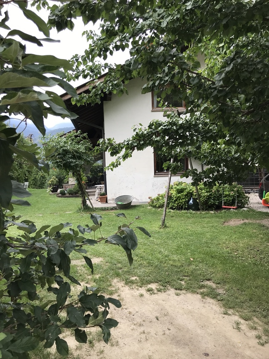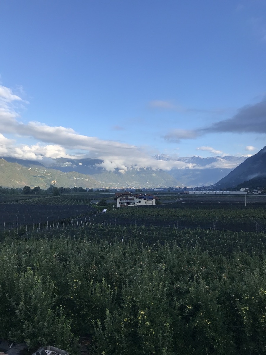 Wir waren ziemlich spät dran mit der Buchung und haben sehr kurzfristig mal wieder über den Roten Hahn eine Ferienwohnung gefunden. Der Mittelberger Hof liegt in Vilpian inmitten von Apfelplantagen. Bis vor Kurzem gab es dort nur Pensionszimmer. Seit diesem Sommer gibt es im Dachgeschoss zwei neu ausgebaute Ferienwohnungen. Wir hatten die Wohnung mit Blick Richtung Meran. Sie war sehr schön und modern ausgestattet. Für vier Personen durchaus ausreichend mit der kleinen Einschränkung das Ausklappsofa und Esstisch sich ein bisschen in die Quere kommen. Aber da drüber mag ich gar nicht nörgeln, weil der Rest so schön war. Direkt am Hof liegt eine Bushaltestelle und die Talstation einer kleinen Seilbahn (die im WinePass inkludiert ist).