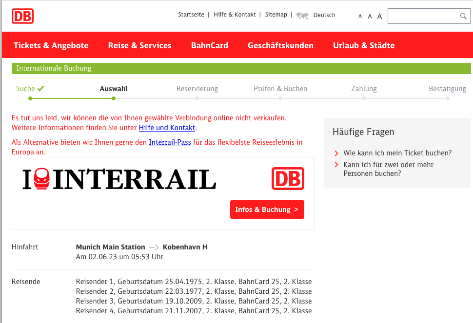 Im nächsten Schritt lande ich aber erst mal auf der internationalen Buchungsseite der DB. Die Verbindung wurde immerhin übernommen, aber ich muss noch mal für alle Mitreisende das Alter eingeben. Diesmal superexakt mit Geburtsdatum. Jetzt aber! Gleich ist es so weit …