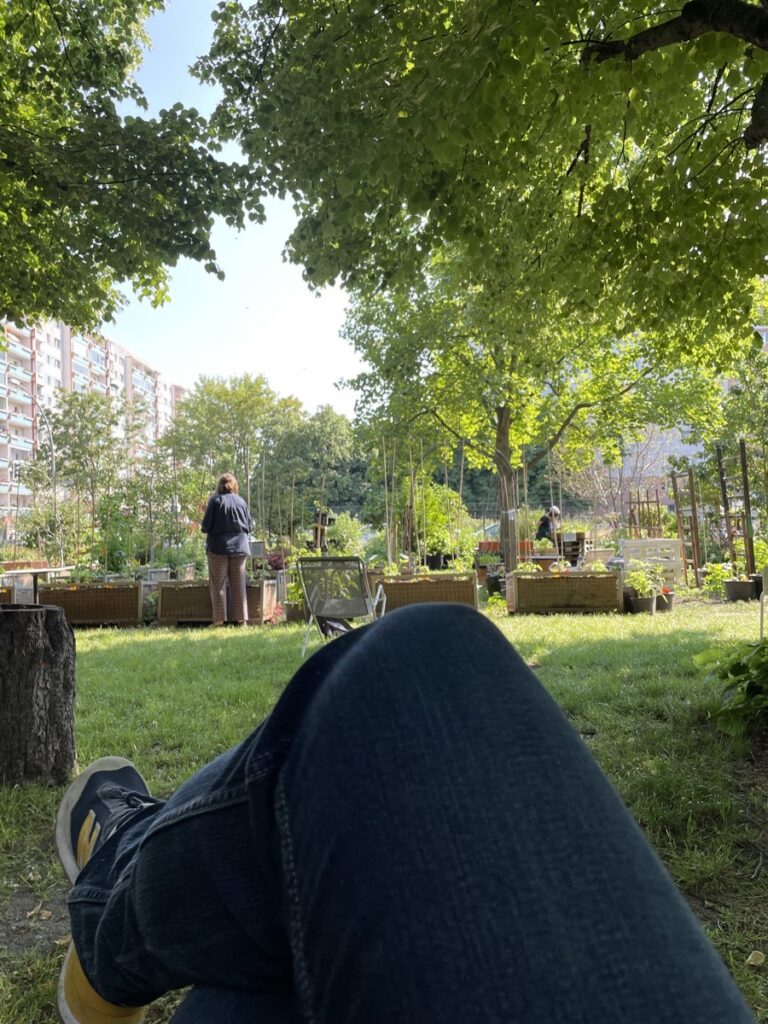 In Hotelnähe stolpere ich zufällig in einen kleinen Stadtgarten rein. Mitten zwischen Beton. Vattenfall hat dort neben seiner Zentrale einen Garten eingerichtet, der für alle offen ist. Keine Ahnung, ob das Greenwashing ist, aber mir kommt es gerade sehr gelegen und ich kann meine Falafel im Liegestuhl mit Blick auf viel Grün essen.