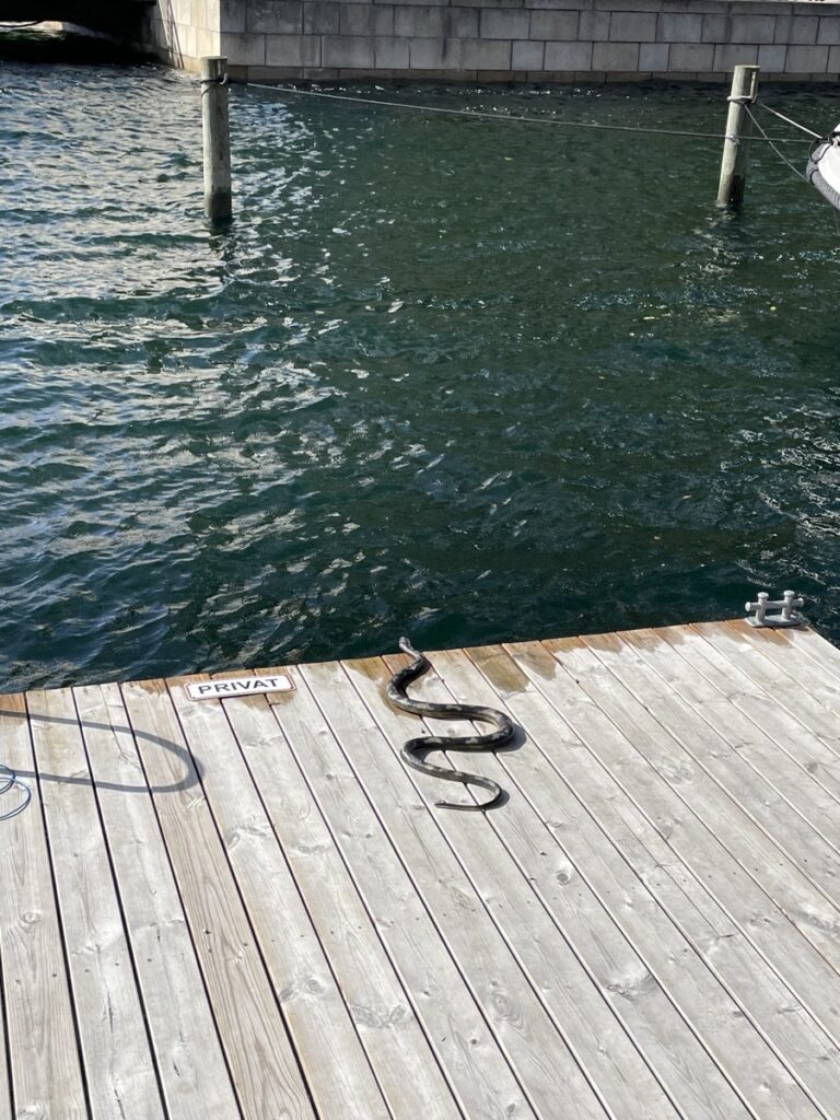 Wir bleiben am Wasser. Bisher hat mich das mit der Nutzung des öffentlichen Raums ja voll überzeugt. Vieles ist für alle kostenlos zugänglich. Hier an diesem Steg will aber jemand offensichtlich wirklich mal seine private Ruhe und hat sich dafür was ganz Besonderes ausgedacht. Wir überlegen fünf Minuten, ob die Schlange echt ist, sind uns immer noch nicht ganz sicher und halten uns vorsichtshalber fern vom Steg. Abschreckungsziel erreicht.
