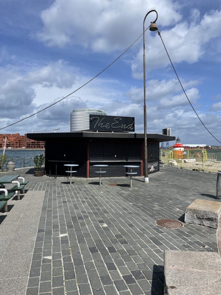 Über vorbildlich ausgebaute Radwege erreichen wir dann die Müllverbrennungsanlage Amager Bakke (aka CopenHill). Sie wurde 2018 fertiggestellt und ist, natürlich, super-zukunftsweisend was die gesamte Technik angeht und die Architektur und überhaupt. In, an und auf dem Gebäude kann man Skifahren, Klettern, was essen oder einfach nur die Aussicht genießen. Während unten Müll verbrannt wird. Der Zugang zum Dach ist, natürlich, wieder kostenlos möglich. Es gibt auch keine Schlangenattrappen, die uns davon abhalten wollen. Nur der Wind, der verhindert, dass wir das Gebäude heute betreten können. Er ist einfach zu stark und alles ist zu, weil: Sikkerhed først, wie der Däne und die Dänin sagen.