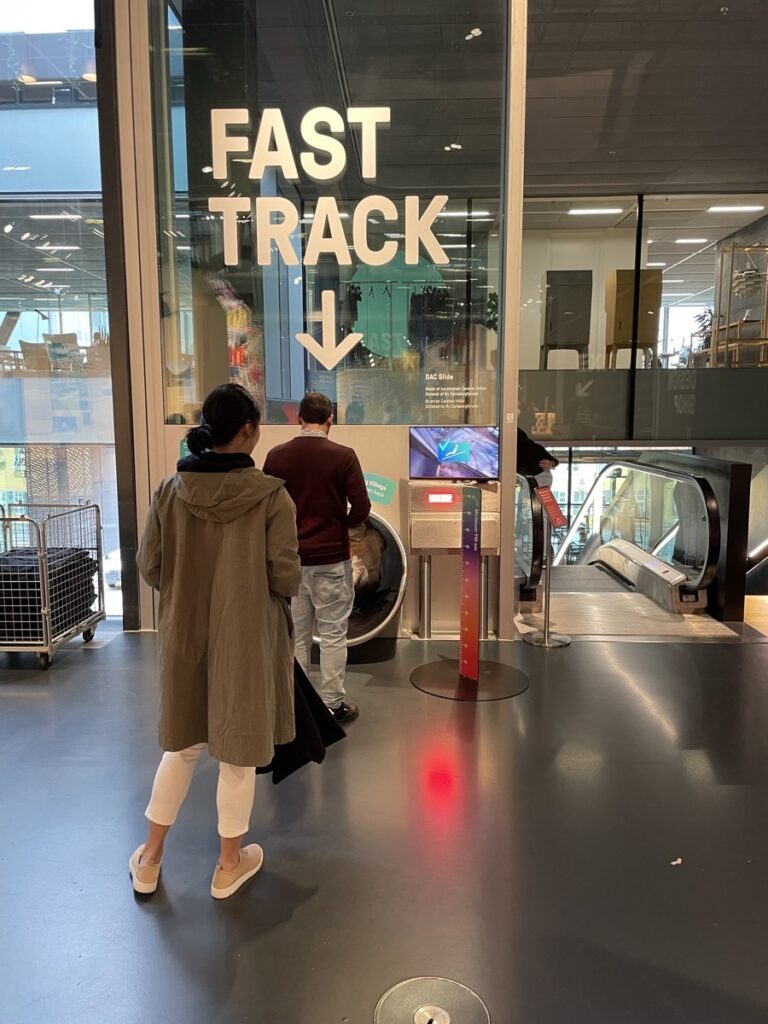 Wir verlassen das Architekturzentrum. Jüngere Familienmitglieder über die Fast-Track-Rutsche.