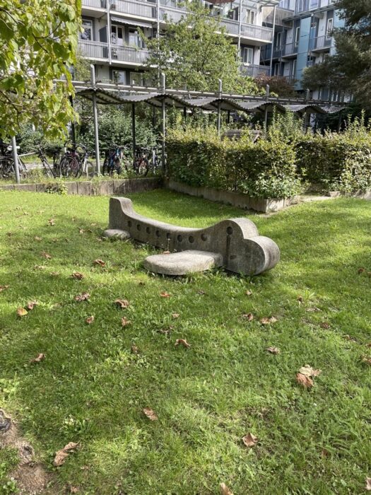 Das Quartier hab ich mittlerweile schon ein paarmal erkundet. Früher wusste ich nicht viel darüber. Seitdem die Lieblingsbibliothekarin da eine Bibliothek eröffnet hat, bin ich öfter dort und hab schon viele Ecken fotografiert. Der Stadtteil hat so ein bisschen den Ruf Problemviertel. Denke aber, das greift viel zu kurz und Ben hat das auch so erlebt. Die Messestadt ist auf dem alten Flughafen Riem errichtet und es gibt an vielen Stellen noch kleine Reminiszenzen an die Vergangenheit. Hier im Hinterhof der geflügelte Bruder vom kleinen ICE.