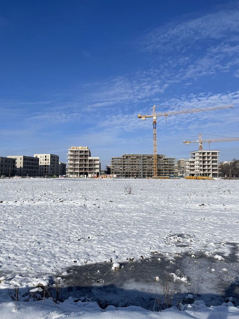 Tief im Westen, wo die Sonne strahlt, entsteht grad ein komplett neuer Stadtteil. Freiham verlängert die Stadt bis fast an die Grenzen zum ländlichen Germering. Menschen leben schon hier, während an anderen Stellen noch Kräne, Bauzäune und leere Flächen das Bild prägen.