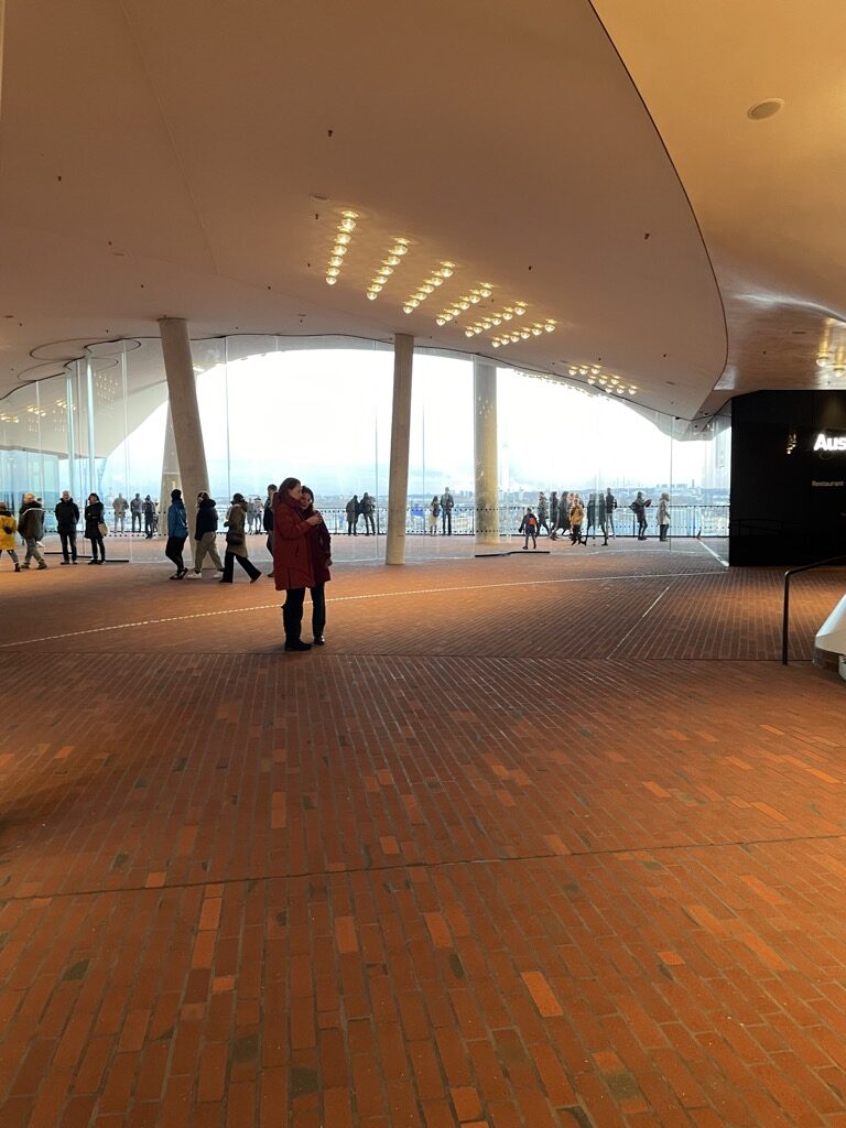 Der Zug fährt pünktlich ab und ich storniere auf Höhe Hackerbrücke das Car-Sharing-Auto. Sieben Stunden später flanieren wir an der Elbe entlang bis hinauf zur und in die Elbphilharmonie.