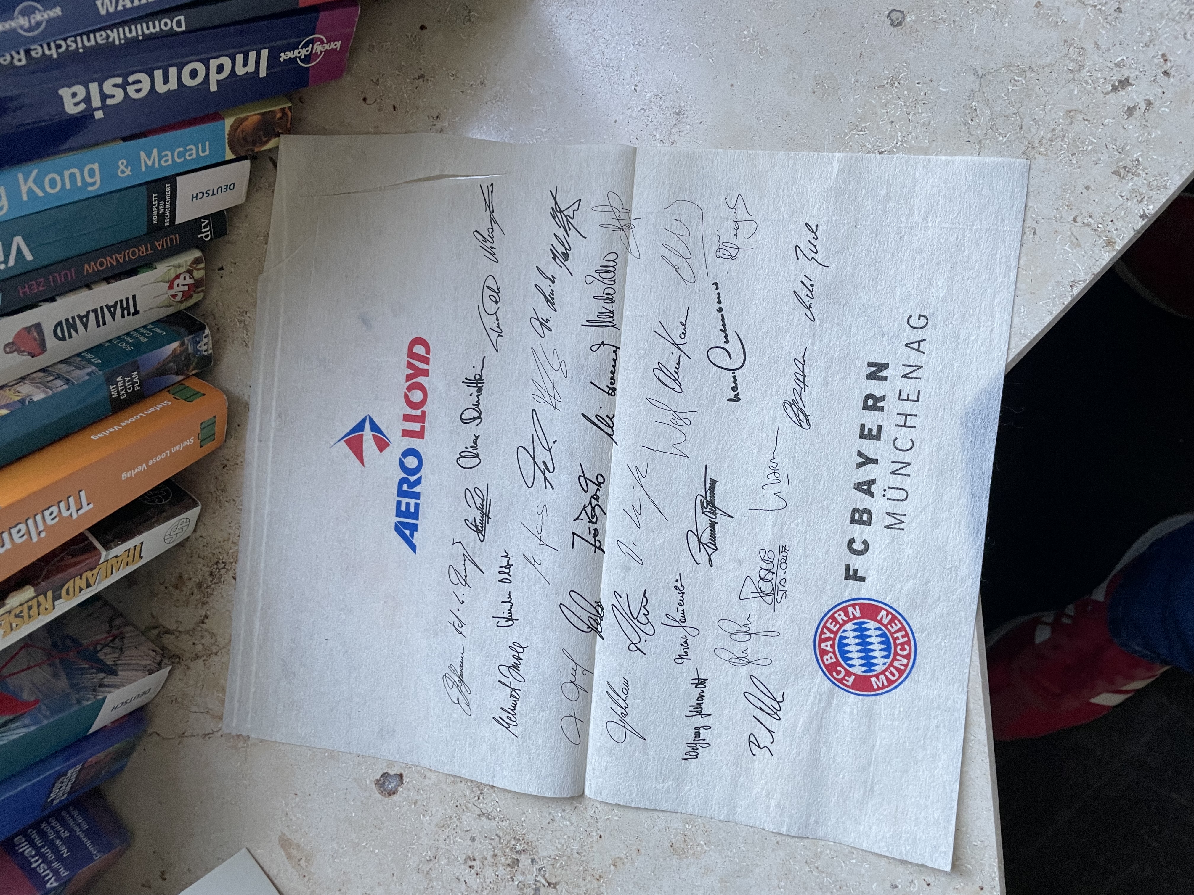 Seltenes Stück | In der Flohmarktecke liegt eine Serviette mit Unterschriften einer FC Bayern Mannschaft. Der erste Detektiv ist in die Recherche gegangen: Aero Lloyd war eine deutsche Fluggesellschaft aus Oberursel. Sie ging 2003 pleite. Bis dahin hat sie den FC Bayern rumgeflogen. Die FC Bayern AG wurde 2001 gegründet. Die Serviette muss also irgendwann zwischen 2001 und 2003 entstanden sein. Bei eBay gibt es ein ähnliches Fundstück mit angeblichen Originalunterschriften. Ich kann auf meinem Stück leider nicht richtig gut erkennen, ob es ein Druck oder handgeschrieben ist (tendierte zu ersterem). Wer weitere sachdienliche Hinweise hat, schreibt gerne in die Kommentare.