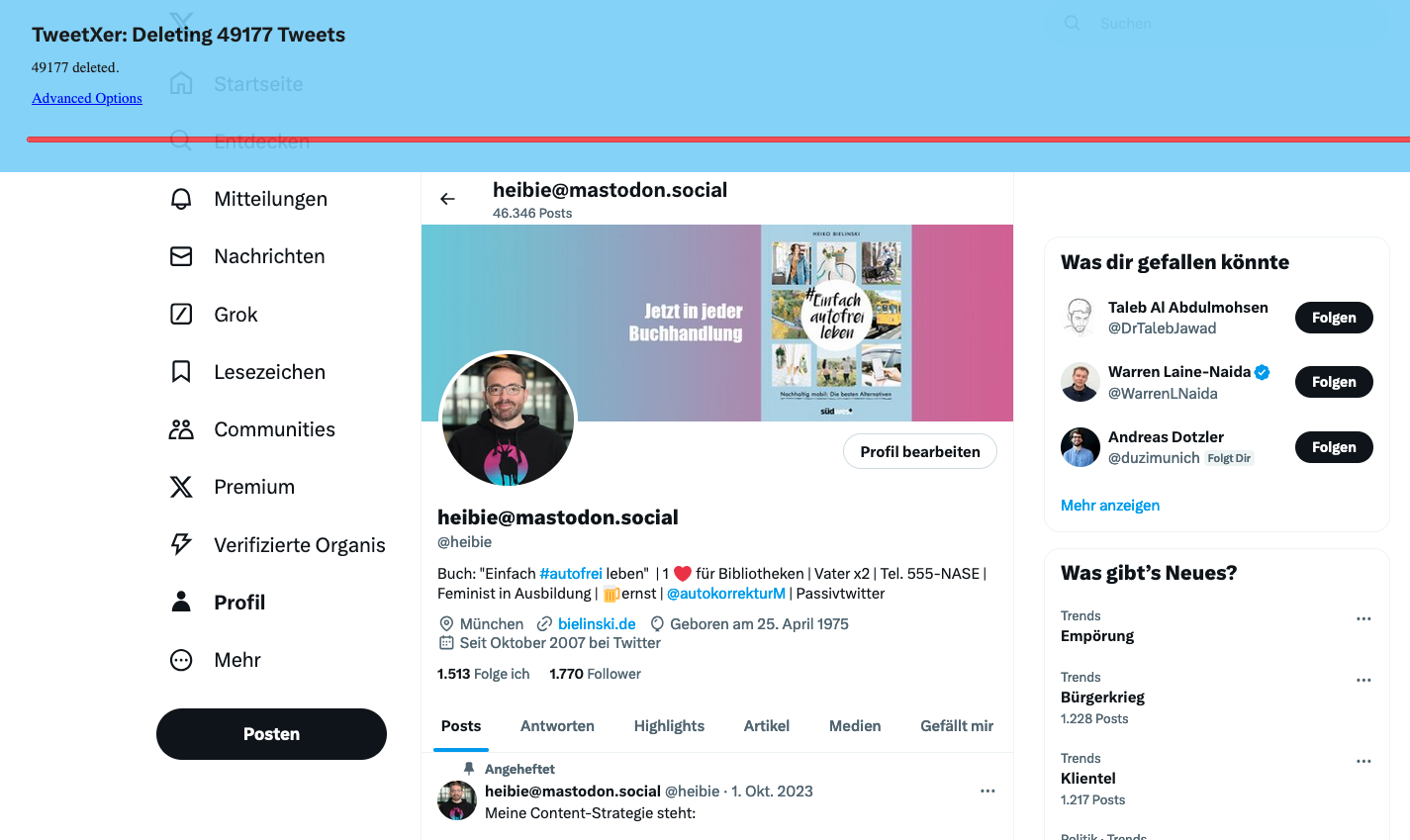 Die beiden Meta Dienste Facebook und Instagram habe ich am Osterwochenende bereinigt. Dort ist das Löschen leider nicht ohne weiteres per Script möglich. Ich habe es sowohl über den Desktop, als auch die jeweiligen Apps versucht. Am Ende ging es in den Apps schneller. Handarbeit bleibt es aber. 2-3 Stunden Klickarbeit habe ich reininvestiert.