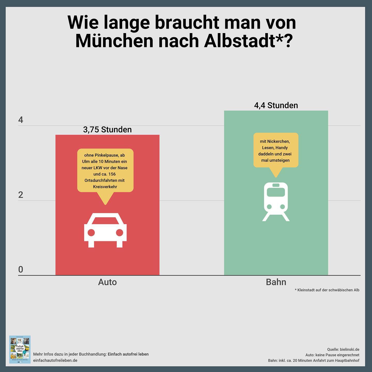 Eine Autofahrt von München ins ländliche Albstadt dauert 3,75 Stunden. Eine Bahnfahrt nur eine gute halbe Stunde länger, obwohl man zweimal umsteigen muss und eine halbe Stunde Aufenthalt in Sigmaringen hat.
