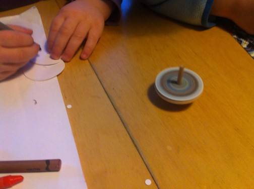 Einfach die vorgestanzten Kreise lösen und die Kinder diese beliebig mit den beigelegten Wachsmalstiften bekritzeln lassen. Diese dann abwechselnd auf den Kreisel legen und loskreiseln. Einfacher geht’s nicht, und den Kreisel finden die Kinder auch Tage später immer wieder ganz amüsant.