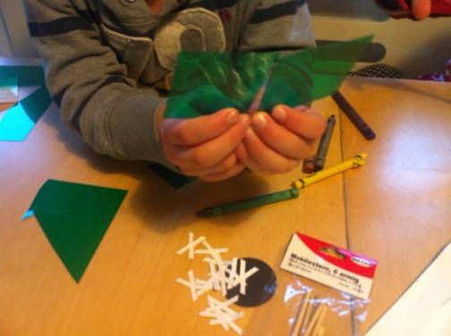 Danach versuchten wir mit den vorgestanzten Schablonen, Figuren auf die Farbfolie zu zeichnen. Bis auf Quadrat und Dreieck waren diese allerdings für beide Kinder v.a. zum Ausschneiden noch zu kompliziert. War aber nicht schlimm, weil die beiden einfach Freestyle-Figuren erfanden. So weit, so gut.