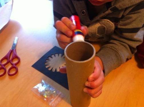 Praktisch war es nach dem Bekleben der Rolle so, dass der ganze Tisch und unsere Hände mit Klebstoff kontaminiert waren. Meinen Kindern mache ich keinen Vorwurf. Jedenfalls klebten die Glitzersterne nun größtenteils an unseren Fingern und am Tisch (was die Kinder lustig fanden), statt sich im Kaleidoskop zu tummeln (was ich mir erhofft hatte). Und die Sterne, die sich tummelten, waren so mit Klebstoff bedeckt, dass sie sich kaum durcheinander wirbeln lassen wollten.