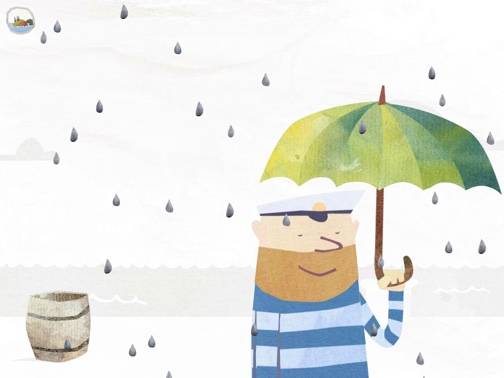 Ebenfalls aus Deutschland kommt die App mit dem Matrosen Fiete. Der begrüßt uns auf dem Startbildschirm winkend, und wir können dann mit einfacher Wischgeste weiter nach rechts scrollen. Auf einer schön illustrierten Insellandschaft gibt es insgesamt 18 verschiedene Icons, hinter denen sich jeweils kleine Geschichten oder einfache Spiele verbergen. Man muss z.B. ein Mini-Memory lösen, Fiete den richtigen Hut aufsetzen oder die Matrosensocken in den Wäschekorb einsortieren.