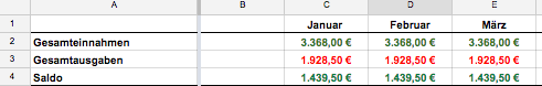Die wichtigsten Zeilen der ganzen Tabelle. Hier hat man Einnahmen, Ausgaben und das Saldo immer auf einen Blick. Man sieht sofort für jeden Monat, ob man noch Geld übrig hat oder schon im Minus steht.