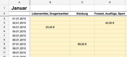 Das Haushaltsbuch wird als Google-Spreadsheet angelegt. Das ist eine Tabellenkalkulation, wie man sie z.B. auch von Excel oder Open Office kennt. Alle Daten werden in einer übersichtlichen Liste erfasst.