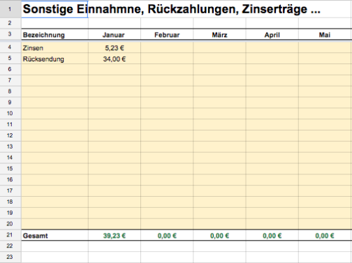 Hier erfassen sie Geldeingänge, die keiner Regelmäßigkeit unterliegen. Z.B. Zinseinkünfte, einmalige Honorare oder Rückerstattungen. Die Bezeichnungen können Sie frei vergeben. Die Sondereinnahmen werden auf der Gesamtübersicht im Einnahmenbereich automatisch übernommen und ebenfalls in das Saldo mit einberechnet.
