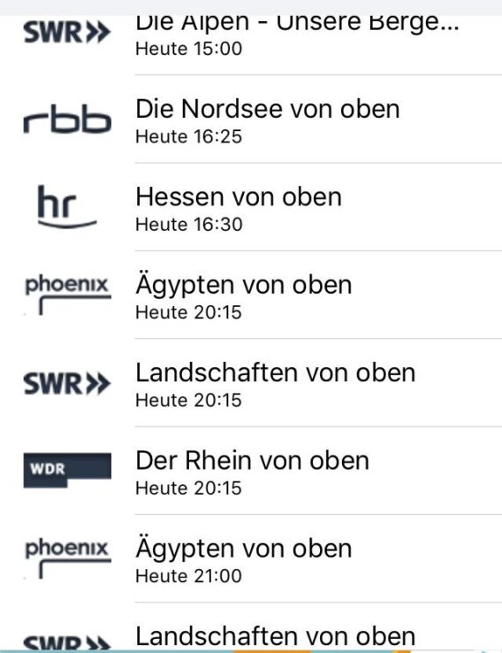 "Das Ruhrgebiet von oben", "Der Südwesten von oben", "Landschaften von oben", "Hessen von oben", "Die Nordsee von oben" und "Ägypten von oben". Ein Streifzug durch das Feiertagsangebot der dritten Programme zeigt eine Tendenz zum Draufblick auf Landschaften.