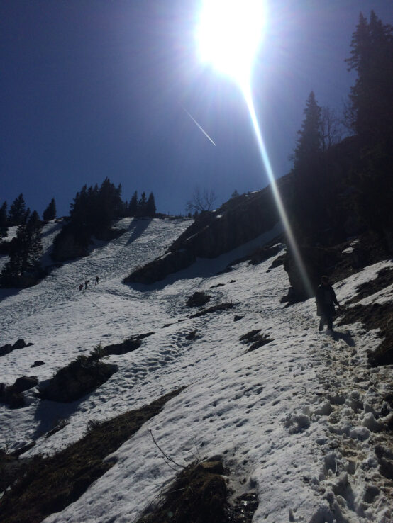 Nach der Pause gehen wir den Gratweg, den wir gekommen sind ein Stück weit zurück, bis uns ein Schild nach links Richtung "Obere Firstalm" den Weg weist. Der obere Teil des Abstiegs ist ziemlich steil und als wir dort waren, lag auch noch ein dickes Schneebrett, dass wir mit ein bisschen Mühe und in den Fußstapfen der Menschen, die vor uns den Weg gingen, geschafft haben. Trittsicher sollte man hier aber schon sein.
