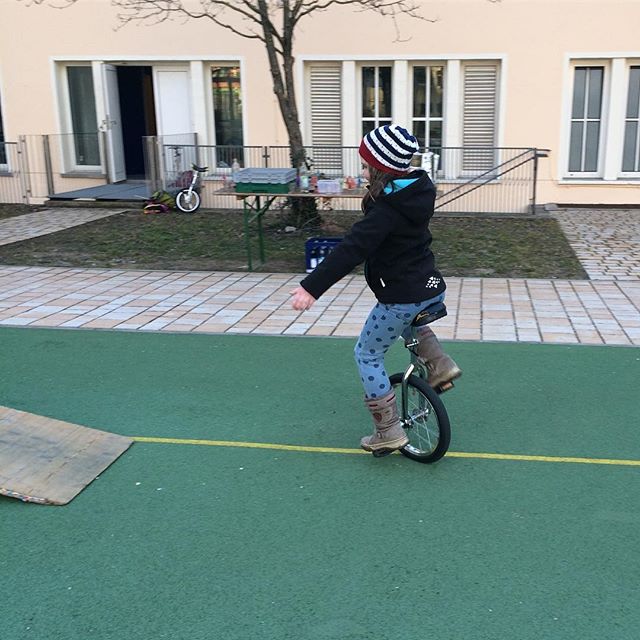 Am Anfang war ich noch ein paar mal dabei, aber seit einem Jahr ist sie eigentlich immer ohne uns Eltern hin und heute schauen wir mal kurz vorbei und siehe da: nach einem Jahr üben fährt sie jetzt tatsächlich Einrad.