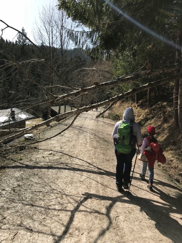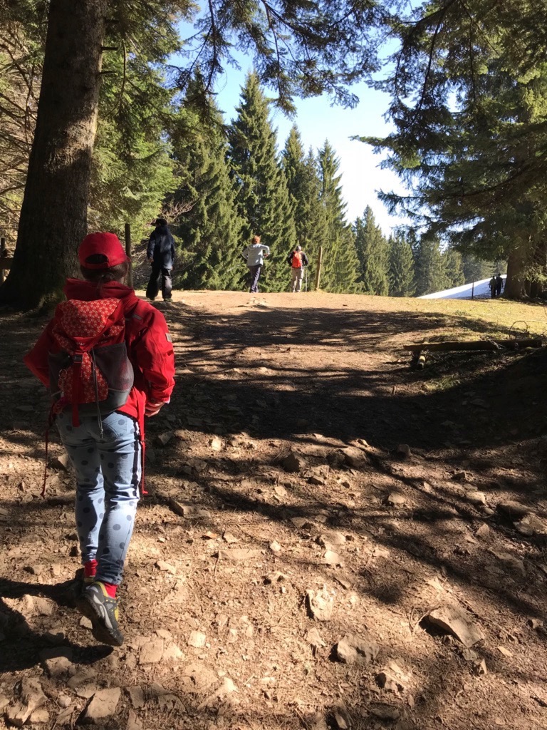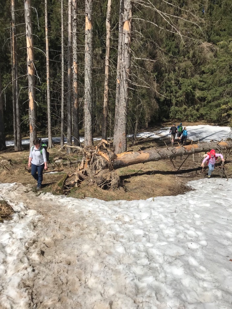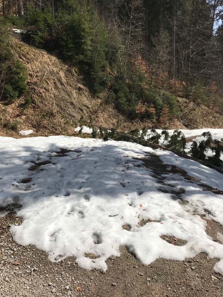 Danach geht es weiter Richtung Gindelalm. Der Weg geht größtenteils durch den Wald und es liegt noch reichlich Schnee.