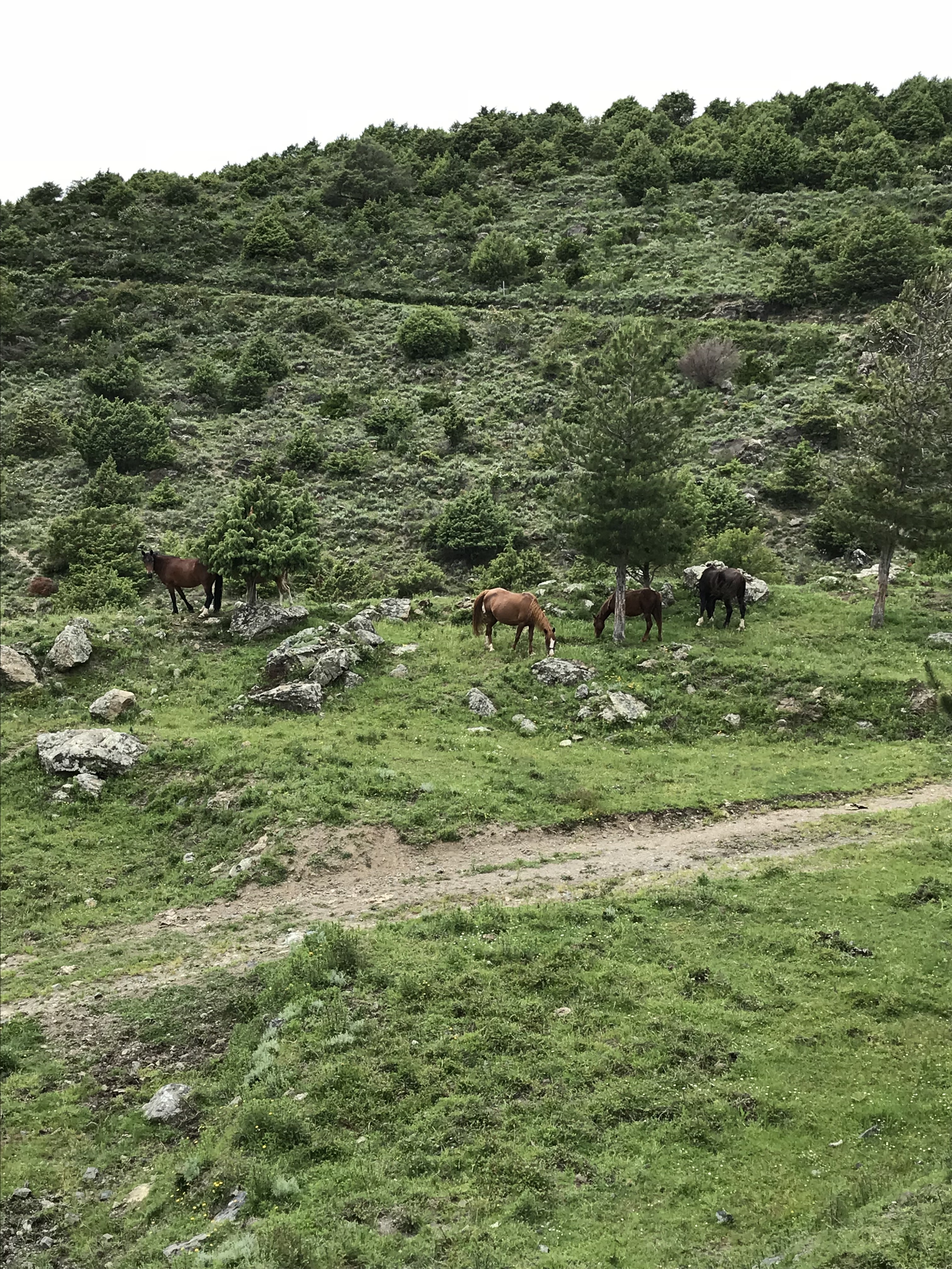 Und zwar nicht auf eingezäunten Weiden, sondern einfach so. Es ist üblich, dass die markierten Tiere frei in der Gegend herumlaufen. V.a. auf den engen, steilen Bergstraßen im Landesinneren muss man eigentlich ständig damit rechnen, dass hinter der nächsten Kurve ein Kuh oder ein Pferd steht. Aber auch auf sehr engen Wanderwegen und am Strand haben wir Kühe getroffen.