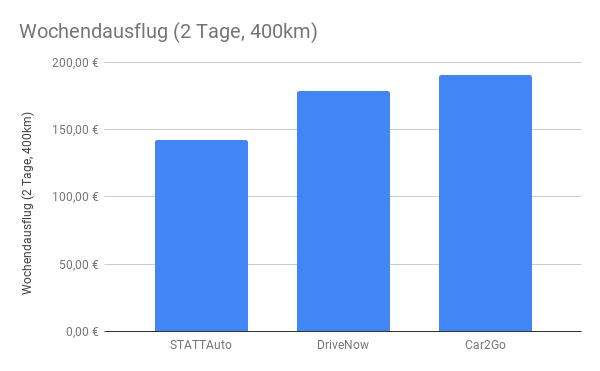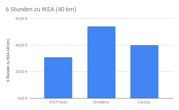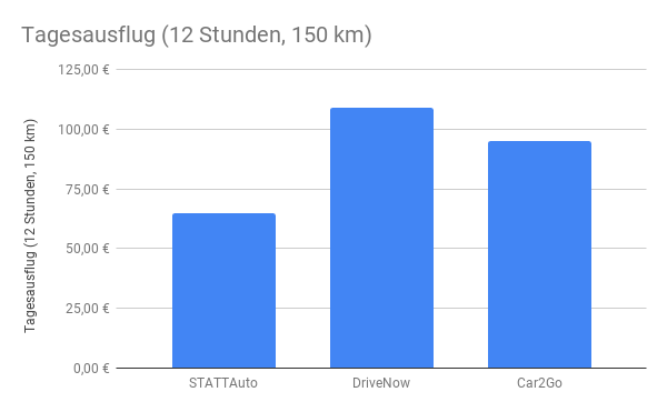 Ich habe mal vier verschiedene Fahrtszenarien zwischen dem stationären Münchner Anbieter STATTAuto (ähnliche Anbieter gibt es in über 600 deutschen Städten und Regionen) und den beiden Free-Floatern Car2Go und DriveNow verglichen (die Preise sind Durchschnittswerte aus den verschiedenen Fahrzeugkategorien der Anbieter)
