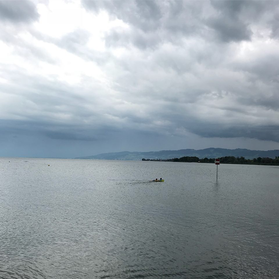 1. Baden im See. Diesmal mit Luftmatratze. Das Wasser auf schweizer Seite ist deutlich wärmer, weil die Gemeinden so reich sind, dass sie den See mit riesigen Tauchsiedern (rechts im Bild) auf Badewannentemperatur erwärmen können.