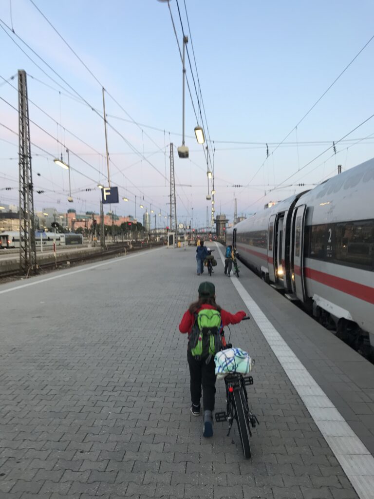 Los geht es am Sonntag Morgen. Sehr früh. Der erste Zug nach Hamburg fährt um 6:16. Den nehmen wir, weil wir froh sind überhaupt noch eine Verbindung mit Fahrradplätzen gefunden zu haben. Fahrradplätze sind im ICE rares Gut, man sollte die so früh wie möglich buchen. Sechs Monate im Voraus kann man buchen, wir haben fünf Monate vor Abfahrt gebucht und das war schon meganervig und fast zu spät.