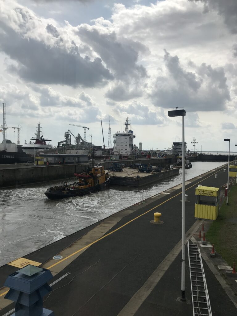 Und weil hier der Nord-Ostsee-Kanal aufhört, kann man an einer riesigen Schleusenanlage zuschauen, wie Schiffe durchgeschleust werden.