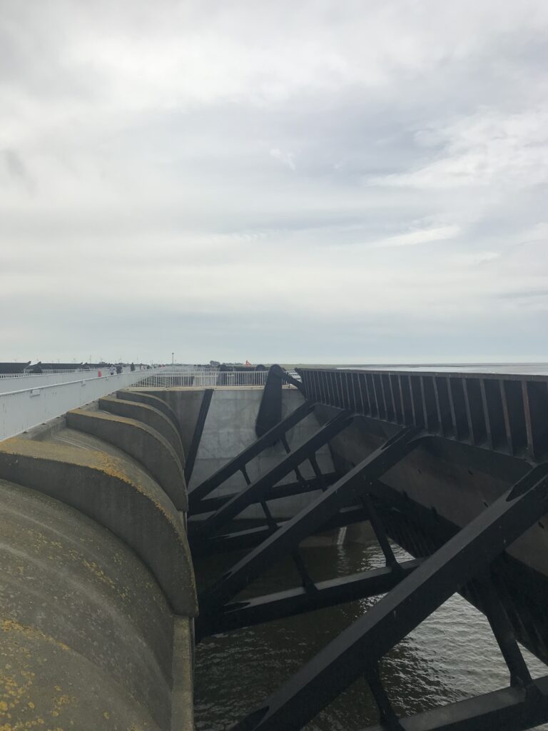 Das Eidersperrwerk ist die größte Küstenschutzanlage der Nordsee. Fünf riesige Tore können geschlossen werden und schützen so vor Sturmflut.