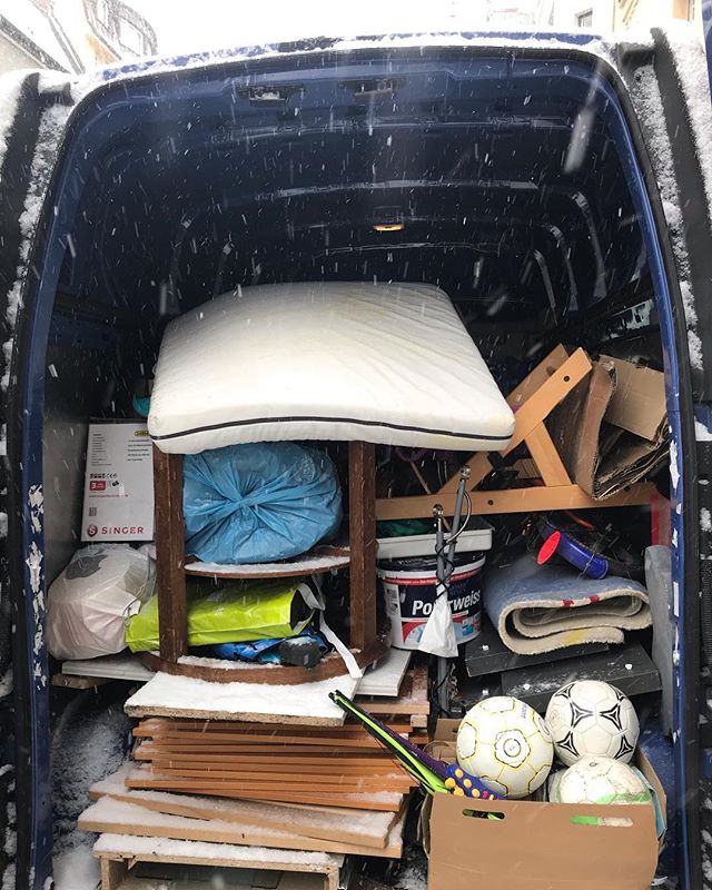 Mit unseren Nachbarn zusammen entsorgen wir zum Jahresanfang unter starkem Schneefall Sperrmüll vom Dachboden des Mehrparteienhauses. Zwei Familien, insgesamt neun Menschen, macht zusammen einen kompletten Transporter voll mit 750 Kilogramm Möbeln, Zeug und Krimskrams. Das erste mal, dass ich auf dem Wertstoffhof auf eine Waage fahren und für die Entsorgung bezahlen muss. Krass, was sich trotz beengter Wohnverhältnisse, in über zehn Jahren für Sachen ansammeln, die nicht mehr benötigt werden (und Mahnung nicht mehr so viel Quatsch einzukaufen)
