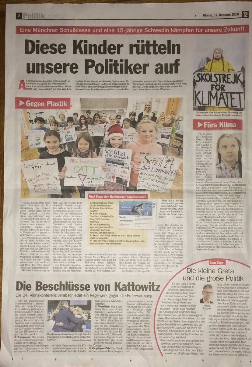 Das Jahr, in dem ich so viel, wie noch nie in meinem Leben auf Demos war. Und schuld sind die Kinder. Schon Ende 2018 hat meine Tochter mit ein paar Freundinnen eine Plastikffrei-Demo in unserem Viertel organisiert. So richtig mit Polizeischutz und abgesperrten Straßen. Im zugehörigen Artikel in der Münchner tz wird in der Seitenspalte von einem schwedischen Mädchen berichtet, die mit einem Schild für Klimaschutz streikt.