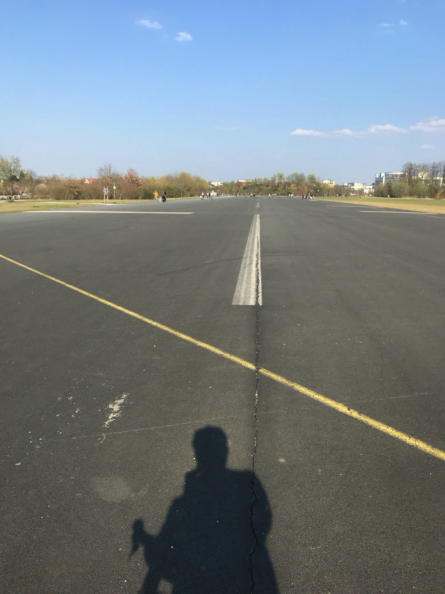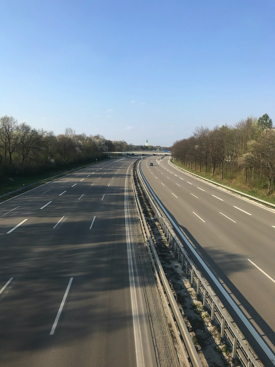Zuerst kommt die Galopprennbahn, dann der kleine See vor der Messe (See 1). Die Straßen in der Messestadt sind leer, die zukünftige Bibliothek im Bau. Weiter geht’s zum Riemer See (See 2). In Ottendichl verkauft jemand Paletten (ohne Bier, 1€). Auf der alten Landebahn vom Fliegerhorst Neubiberg ist viel Platz zum Distanzieren. Vor dem Unterhachinger Stadion glitzert dann noch der namenlose See 3 in der Sonne. Auf der A8-Einflugschneise aus den Bergen heute eher wenig Rückreiseverkehr.