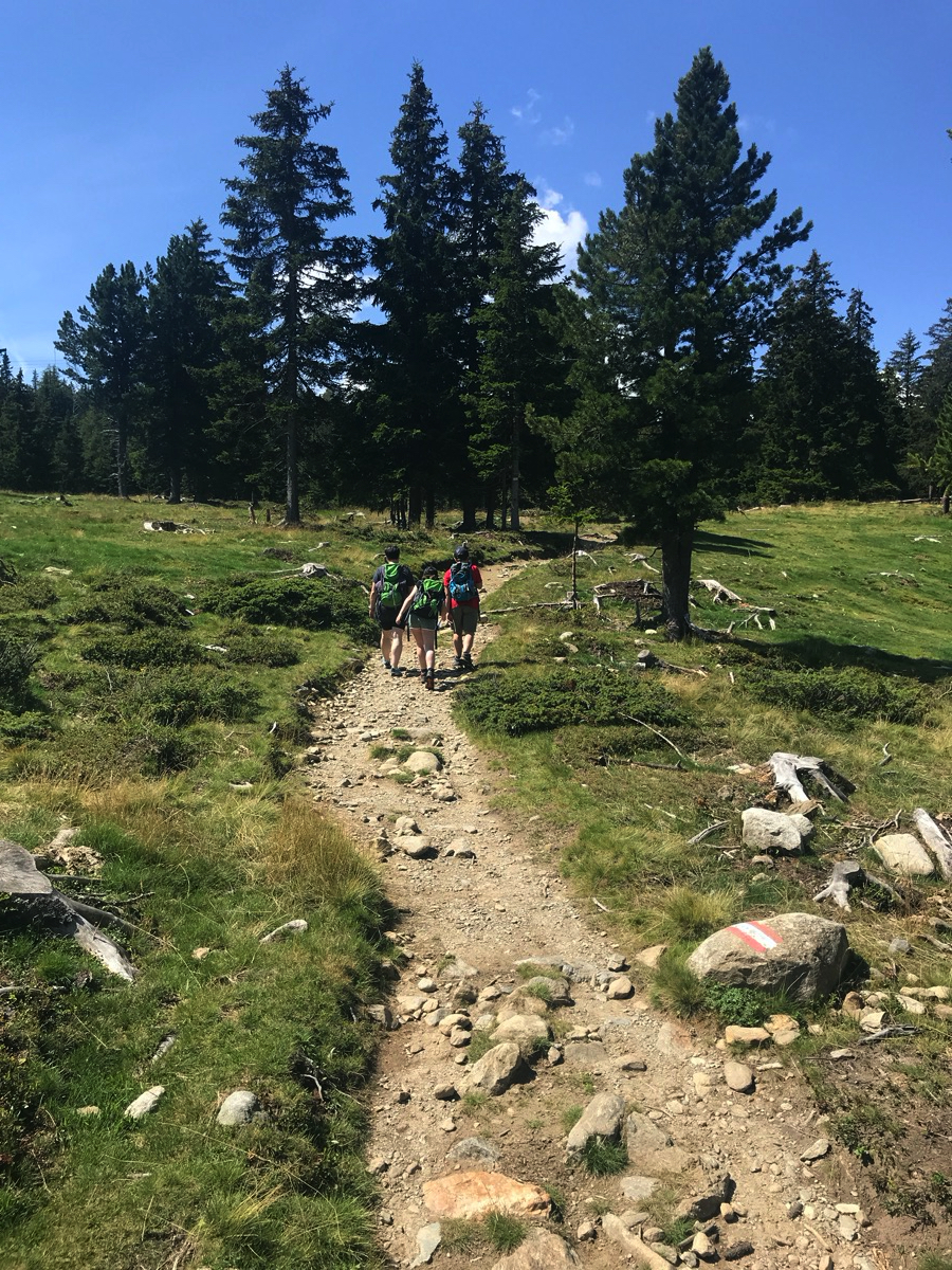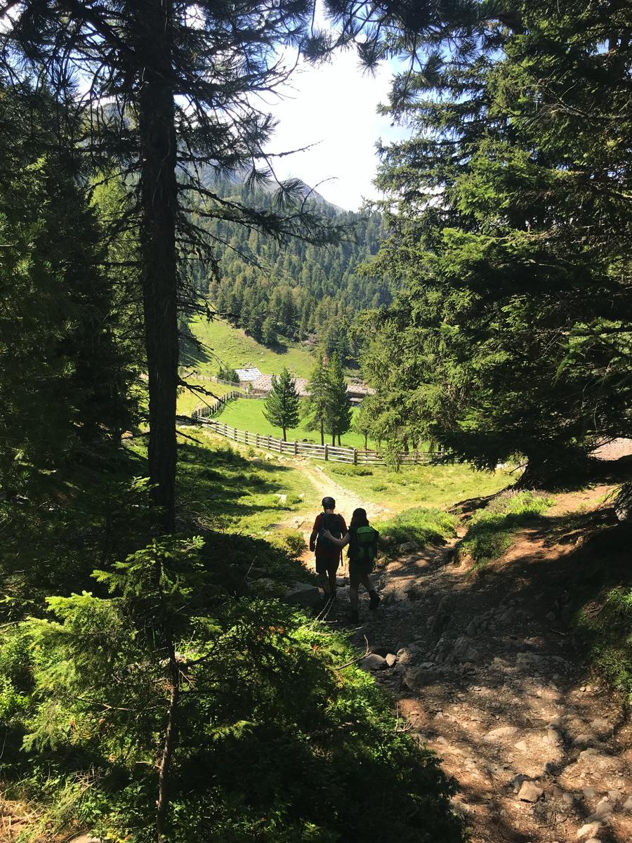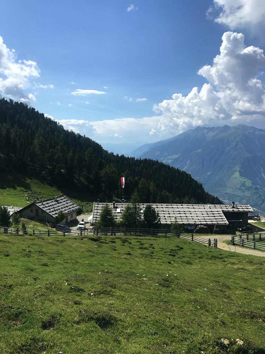 Von hier aus geht es jetzt an ein paar Höhenmeter. Wir steigen auf zur Naturnser Alm.